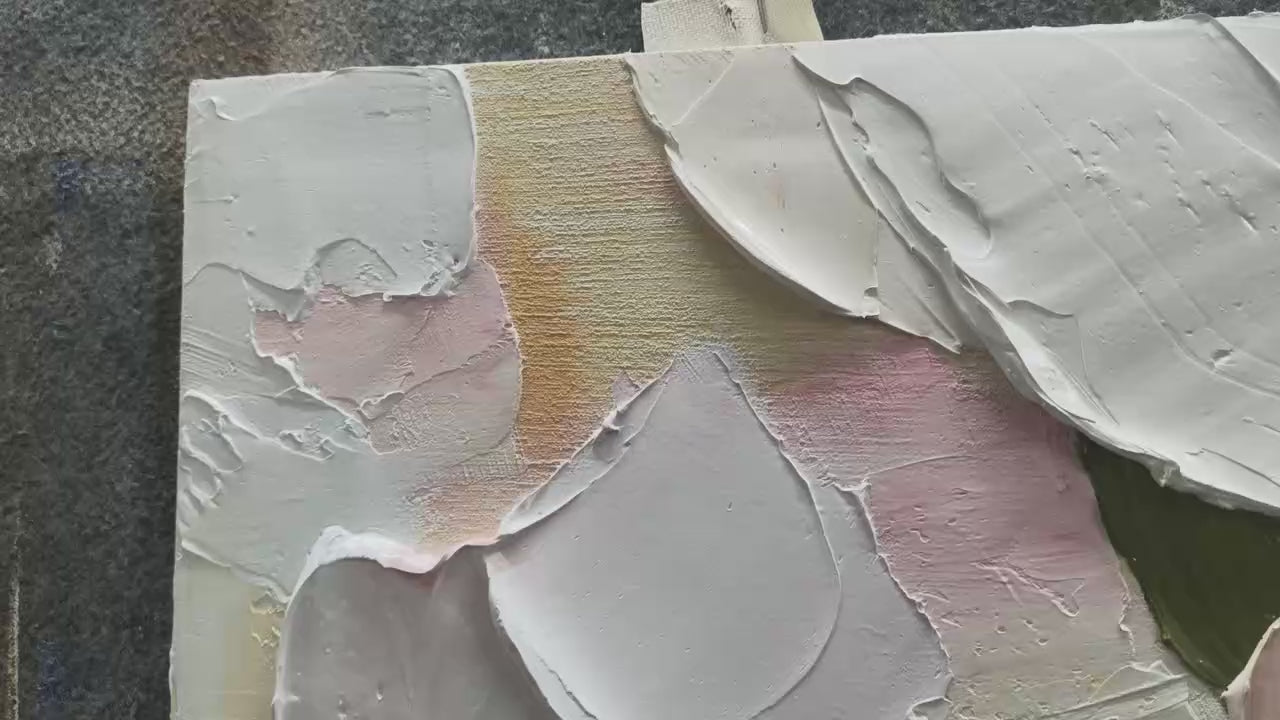 • Availability: This is a soft, abstract painting defined by its rich, heavy impasto texture. The canvas is filled with broad, overlapping palette knife strokes in a gentle pastel color palette. Shades of blush pink, creamy white, warm beige, and muted sage green create a patchwork effect that resembles a close-up of flower petals or thick frosting. The thick application of paint adds significant depth and a tactile, sculptural quality to the artwork, evoking a sense of calm and sweetness.
